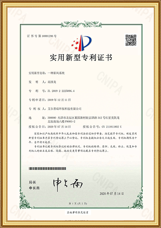 • 實用新型專利證書(一種新風系統(tǒng))
